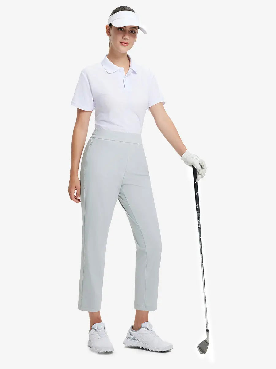 Stay fresh and comfortable all day in our Women's 7/8 Ankle Golf Track Pants. With 4-way stretch, quick-dry, UPF 30+, and moisture-wicking features, these pants offer a perfect fit with an elastic waistband and adjustable drawstring. Enjoy full coverage and freedom of movement in these versatile athletic pants.