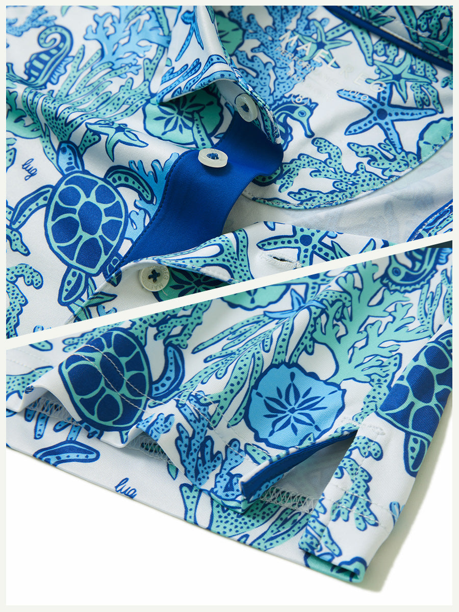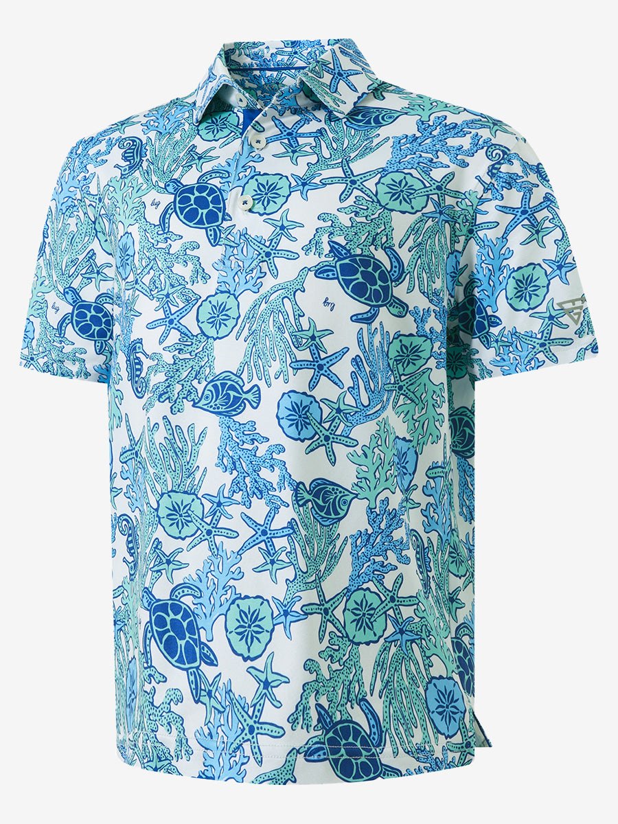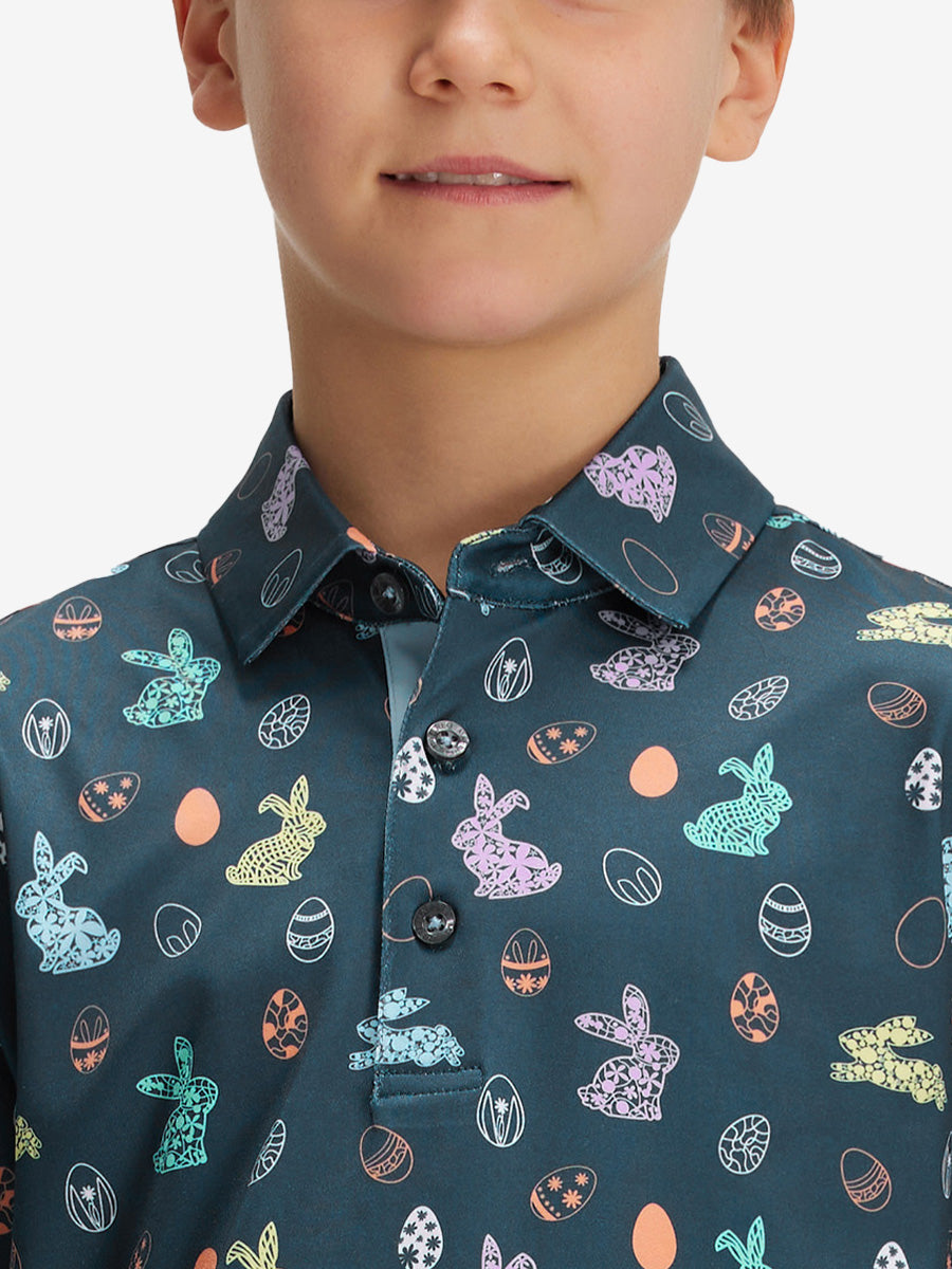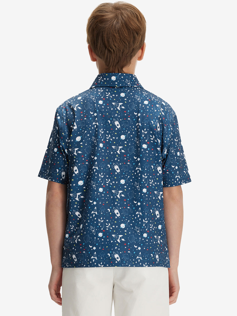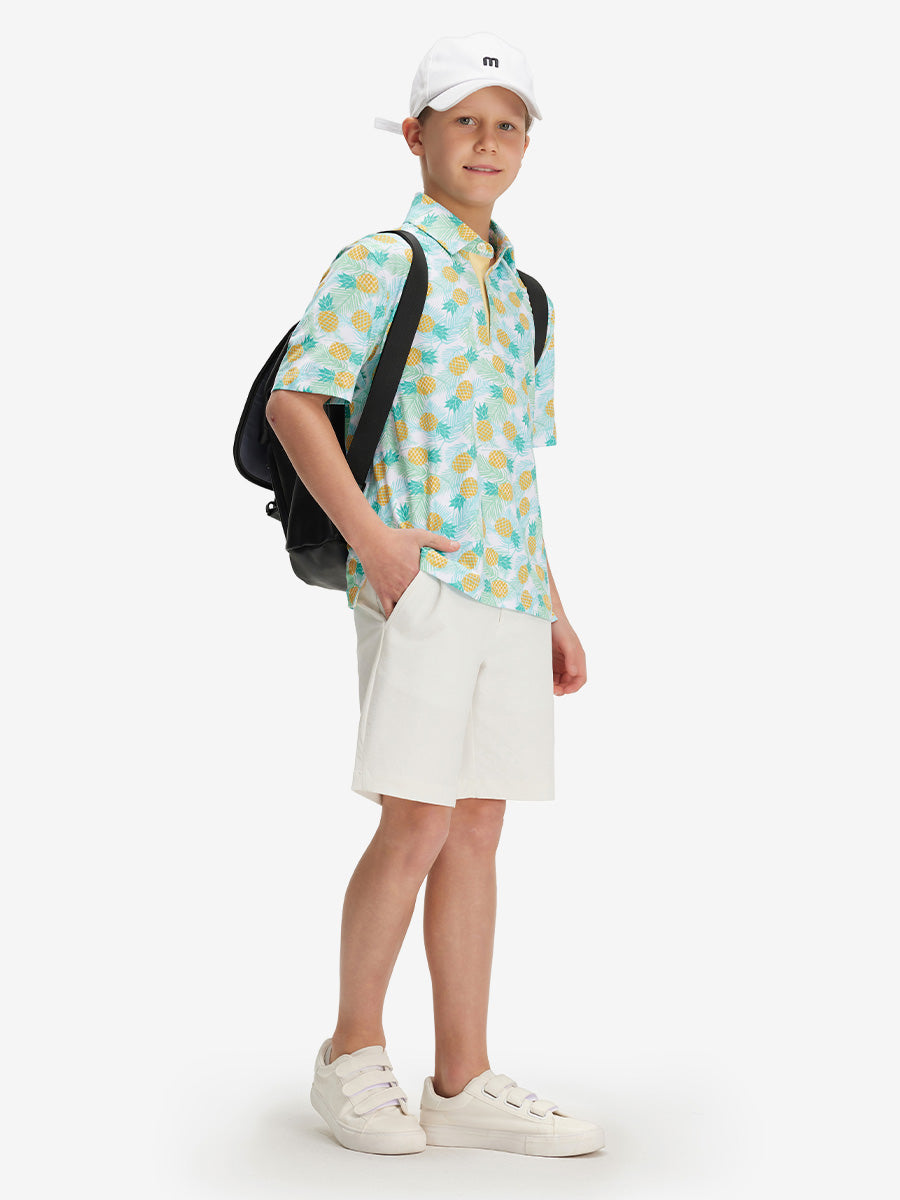 Get your little golfer ready for adventures with our Performance Print Boys Golf Polo. Crafted from top-notch fabric that wicks moisture, stays light, and shields with UPF 50+. Let him swing freely with the split hem and stretchy fabric. Watch him rock the course in fun animal and plant prints that never fade, making him the cutest golfer around!