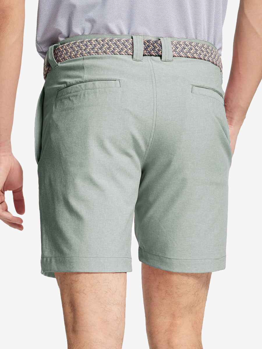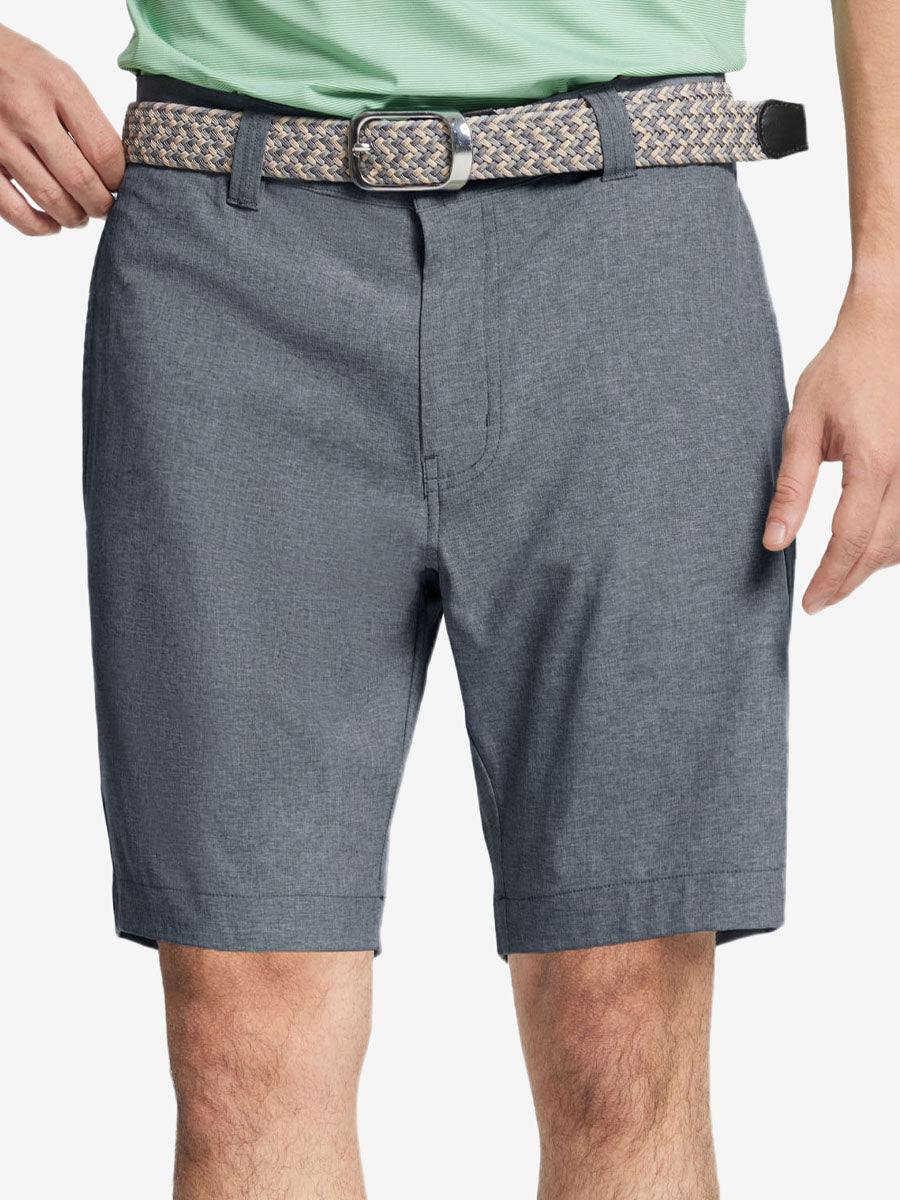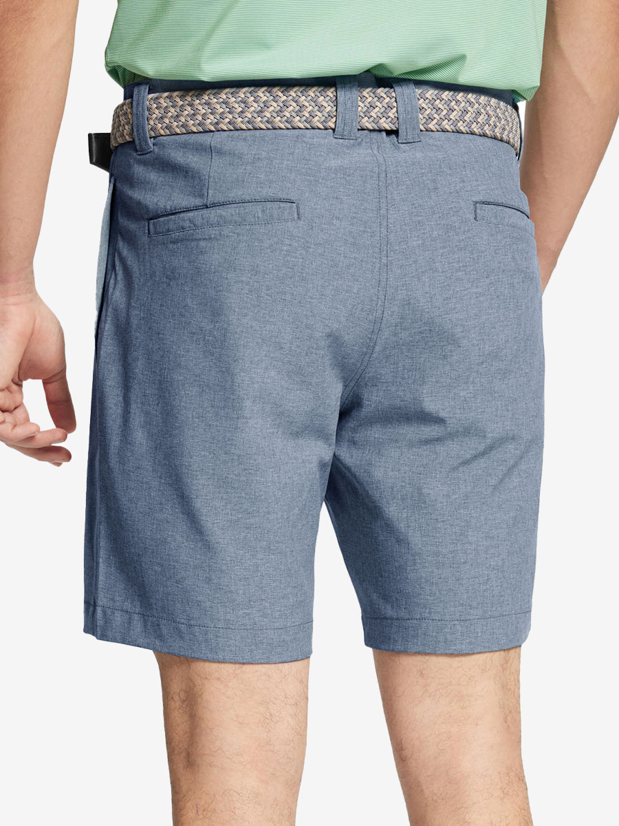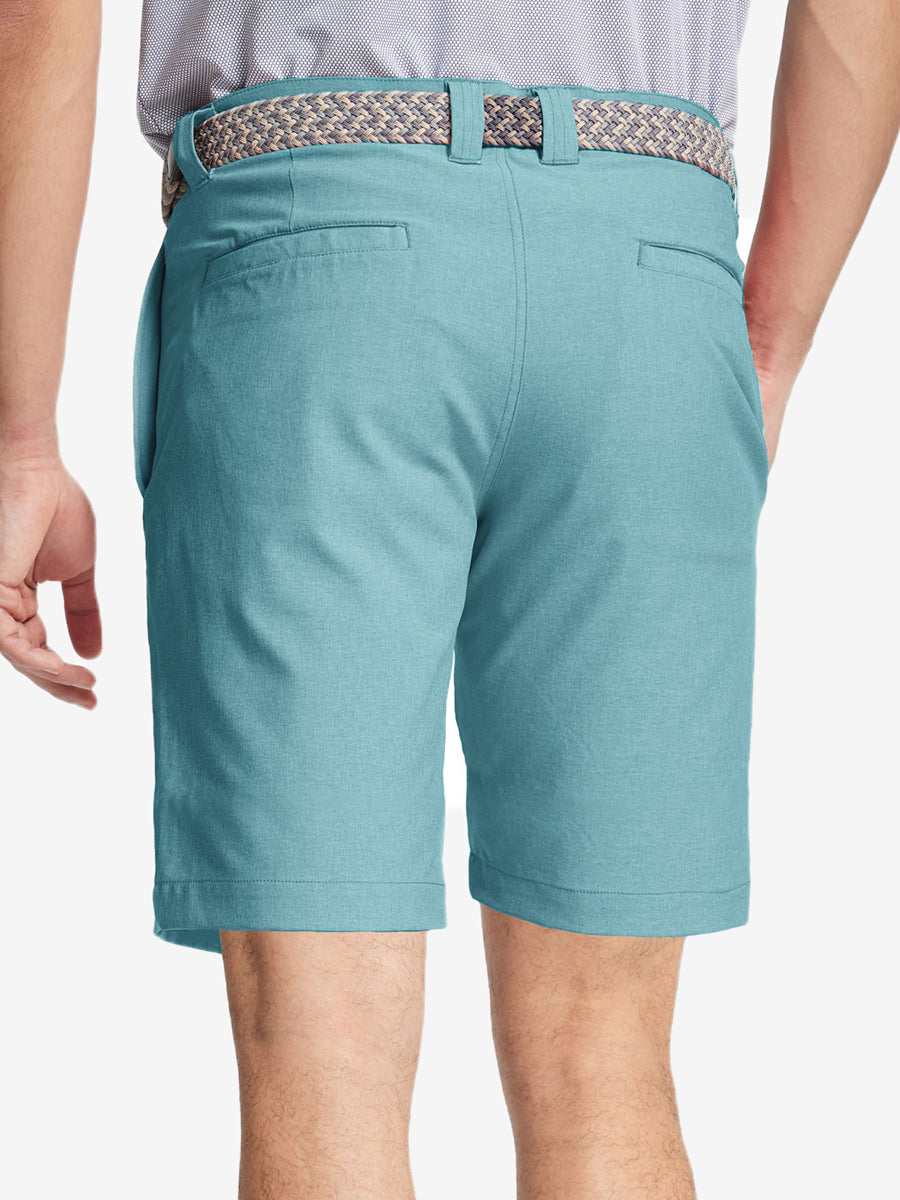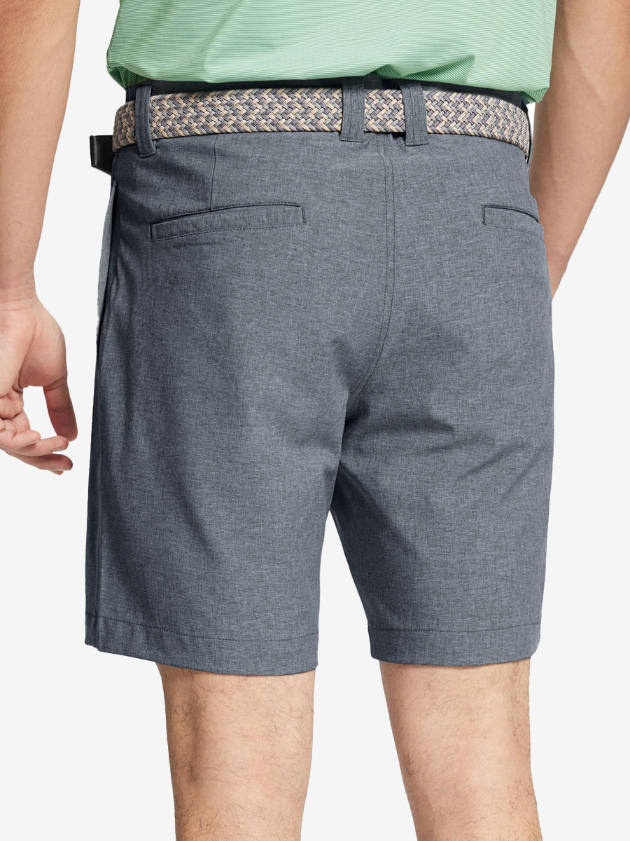 Presentamos nuestros pantalones cortos de golf Heather Performance, diseñados para ofrecer comodidad y flexibilidad con materiales respetuosos con la piel y una excelente elasticidad. Estos pantalones cortos para hombre cuentan con propiedades de absorción de humedad, secado rápido y UPF 50+ para una mayor transpirabilidad y frescura. Mejorados con elegantes detalles jaspeados, son perfectos para el campo de golf o para uso casual, combinando moda con funcionalidad sin esfuerzo.