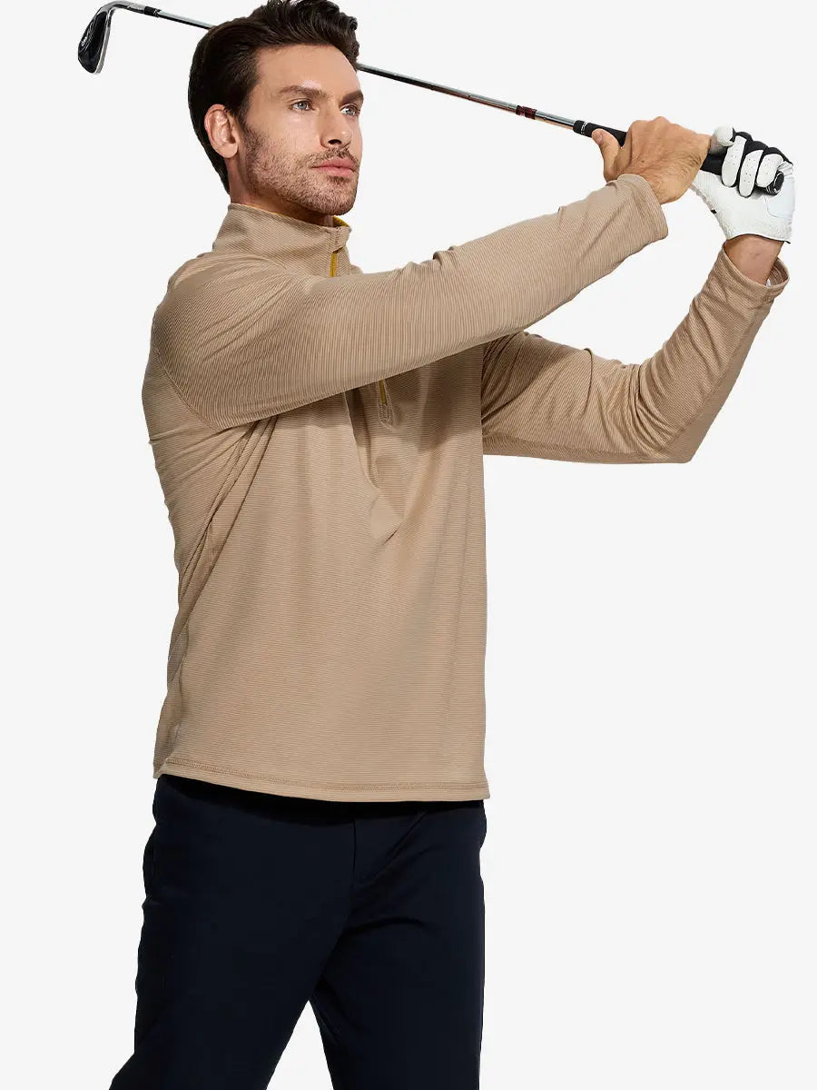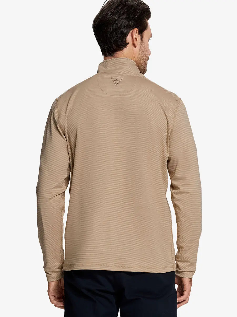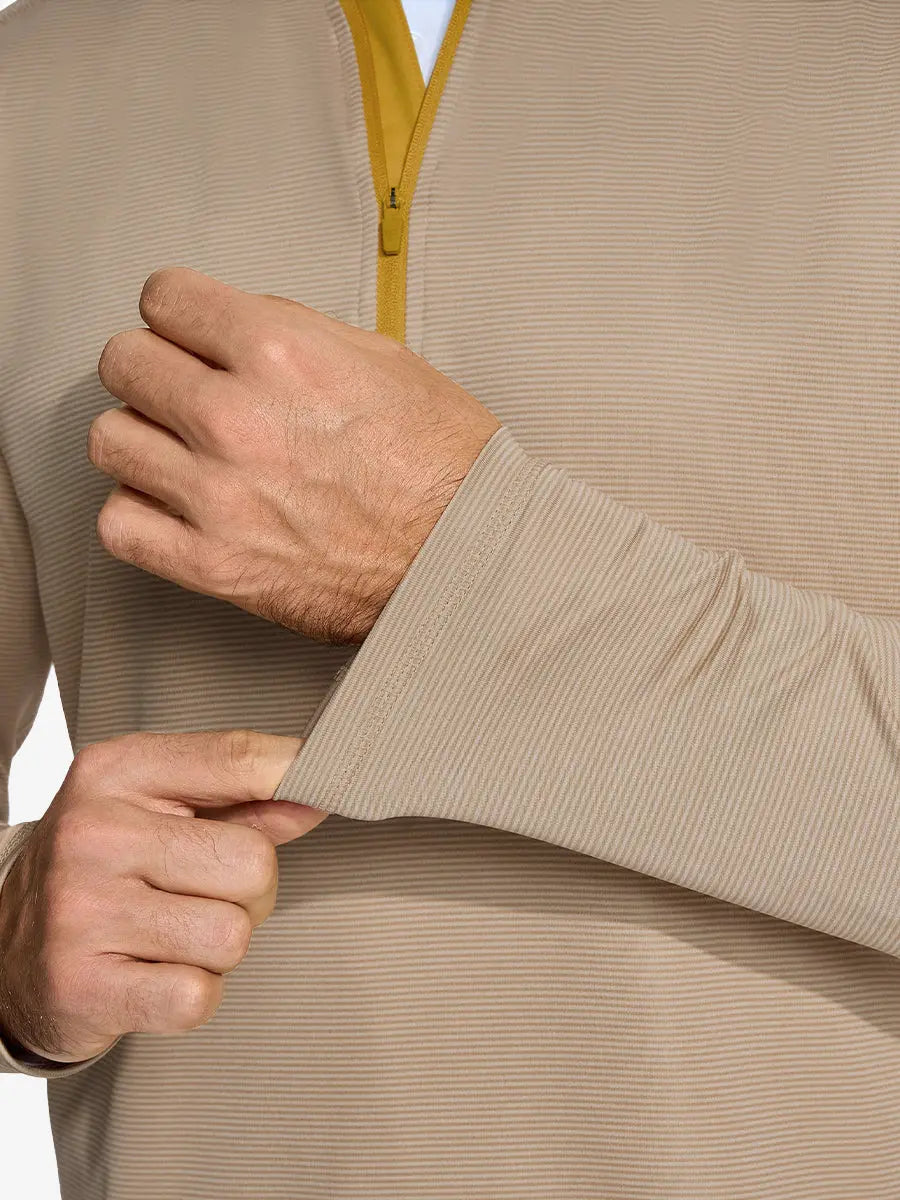 Our men's quarter zip pullover is made from high-quality yarn-dyed striped polyester, offering moisture-wicking, breathability, UPF30+ protection, and 4-way stretch for ultimate comfort. The stylish design features a 1/4 zipper for easy wear and a mock neck for UV protection and warmth. Ideal for outdoor activities and athletic performance.